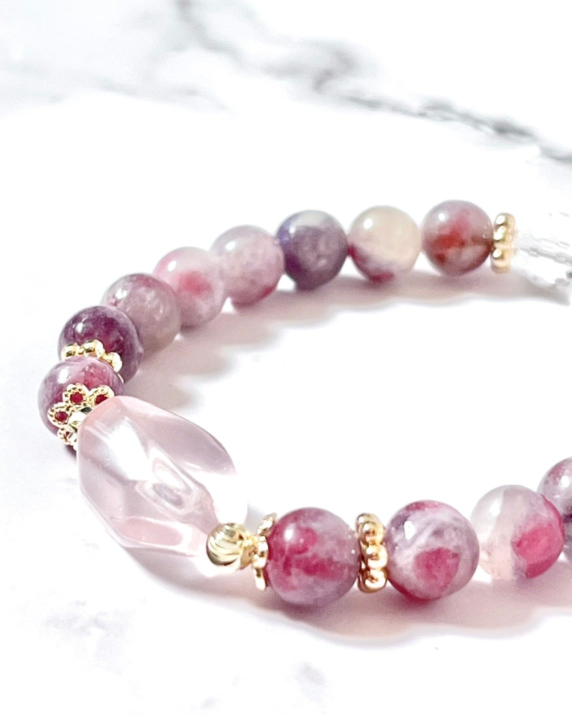 レピドライトのパープル・トルマリンのピンク・シリカ成分のホワイトが美しく混ざり合った天然石です。