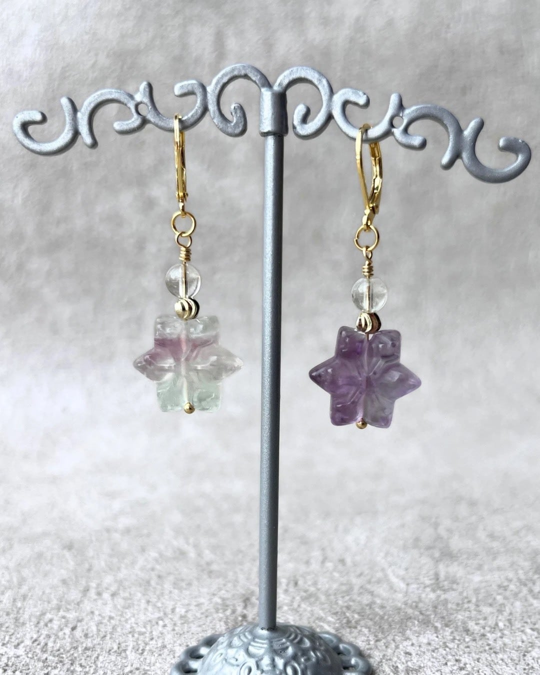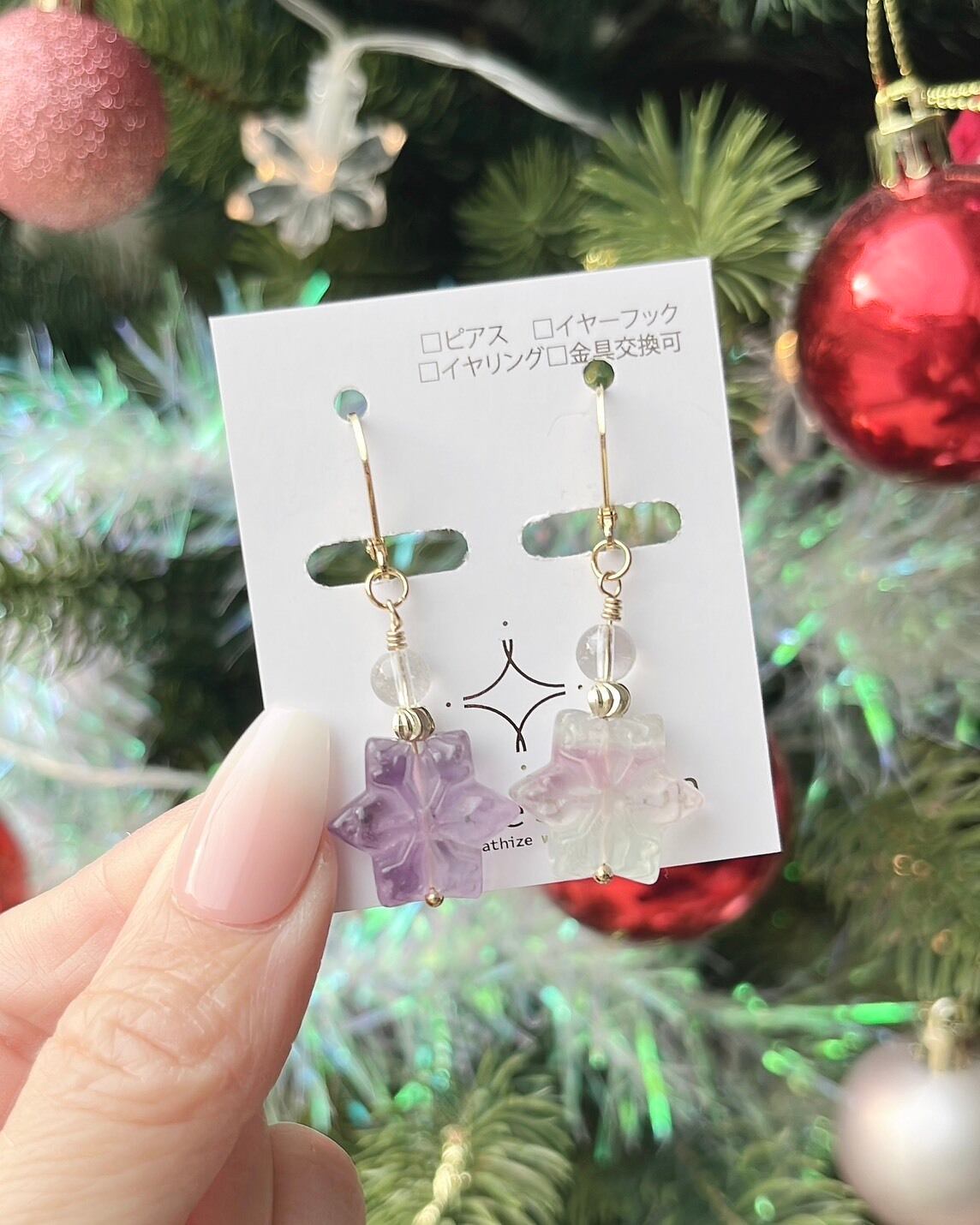 ホリデーシーズンにぴったりの、雪の結晶型のフローライトのピアスです。